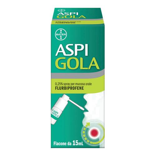 Deve essere utilizzata la minima dose efficace per il minor tempo necessario al fine di alleviare i sintomi (vedere paragrafo 4.4). Aspi Gola Collutorio. Posologia. Adulti: 2-3 sciacqui o gargarismi al giorno con 10 ml (1 misurino) di collutorio. Popolazione pediatrica. Bambini di eta' superiore a 12 anni: come per gli adulti. Bambini di eta' inferiore a 12 anni: non somministrare ai bambini di eta' inferiore a 12 anni (vedere paragrafo 4.3). Popolazioni speciali. Anziani: i dati clinici al momento disponibili sono limitati, pertanto non puo' essere fatta alcuna raccomandazione riguardante la posologia. Gli anziani hanno un maggior rischio di gravi conseguenze in caso di reazioni avverse (vedere paragrafo 4.4). Pazienti con insufficienza epatica: non e' necessaria una riduzione del dosaggio in pazienti con insufficienza epaticada lieve a moderata. Flurbiprofene e' controindicato in pazienti con insufficienza epatica grave (vedere paragrafo 4.3). Pazienti con insufficienza renale: non e' necessaria una riduzione del dosaggio in pazienti con insufficienza renale da lieve a moderata. Flurbiprofene e' controindicato in pazienti con insufficienza epatica grave (vedere paragrafo 4.3). Modo di somministrazione: per uso orofaringeo. Sciacquare o mantenere in bocca durante i gargarismi fino a 1 minuto. Non ingerire.Il collutorio puo' essere usato puro o diluito in mezzo bicchiere d'acqua. Aspi Gola Spray per mucosa orale. Posologia. Adulti: applicare una dose (2 spruzzi) 3 volte al giorno, indirizzati direttamente sulla parte interessata. Ogni spruzzo eroga 0,2 ml di soluzione, equivalentia 0,5 mg di principio attivo. Popolazione pediatrica. Bambini di eta'superiore a 12 anni: come per gli adulti. Bambini di eta' inferiore a12 anni: non somministrare ai bambini di eta' inferiore a 12 anni (vedere paragrafo 4.3). Popolazioni speciali. Anziani: i dati clinici al momento disponibili sono limitati, pertanto non puo' essere fatta alcuna raccomandazione riguardante la posologia. Gli anziani hanno un maggior rischio di gravi conseguenze in caso di reazioni avverse (vedere paragrafo 4.4). Pazienti con insufficienza epatica: non e' necessaria una riduzione del dosaggio in pazienti con insufficienza epatica da lieve a moderata. Flurbiprofene e' controindicato in pazienti con insufficienza epatica grave (vedere paragrafo 4.3). Pazienti con insufficienzarenale: non e' necessaria una riduzione del dosaggio in pazienti coninsufficienza renale da lieve a moderata. Flurbiprofene e' controindicato in pazienti con insufficienza epatica grave (vedere paragrafo 4.3). Modo di somministrazione: per uso orofaringeo. Indirizzare l'erogatore verso la parte posteriore della gola e spruzzare sulla parte interessata.