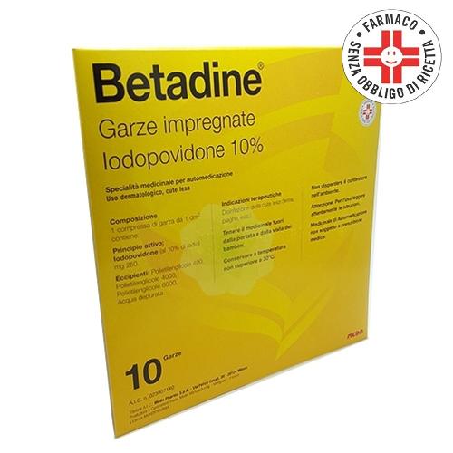 Betadine 10% Gel : 100 g di gel contengono il principio attivo: iodopovidone (al 10% di iodio) 10 g. Betadine 10% Garze impregnate 1 compressa di garza da 1 dm^2 da 3 g contiene il principio attivo: iodopovidone (al 10% di iodio) 0,25 g. Per l'elenco completo degli eccipienti, vedere paragrafo 6.1.