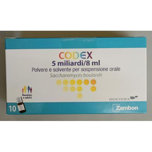 Codex 5 miliardi/8 ml polvere e solvente per sospensione orale. Ogni flaconcino contiene il principio attivo: Saccharomyces boulardii 5 miliardi di germi vivi (sotto forma di 250 mg di polvere liofilizzata). Eccipienti con effetti noti: alcol benzilico, etanolo, fruttosio, lattosio, propilene glicole, sodio benzoato. Per l'elenco completo degli eccipienti, vedere paragrafo 6.1.
