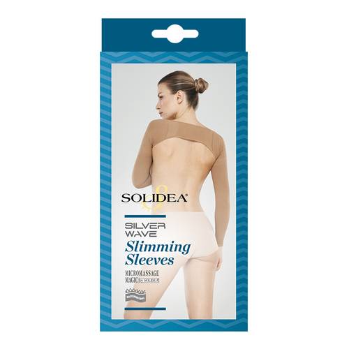 Maniche micromassaggianti lunghe fino al polso, senza cuciture, indicate per contrastare l’aspetto a buccia d’arancia sulle braccia, con innovativo supporto dorsale che le sostiene avvolgendo le spalle per una perfetta vestibilità. Il tessuto micromassaggiante con i naturali movimenti degli arti superiori stimola la microcircolazione per una efficace azione anti-cellulite. Inoltre la compressione graduata decrescente 15/21 mmHg dal polso alla spalla aiuta il ritorno venoso e il drenaggio linfatico, pertanto é indicato anche nei linfedemi agli arti superiori post-traumatici e iatrogeni (mastectomia). Realizzato in filato batteriostatico agli ioni d’argento, garantisce il mantenimento dell’equilibrio biologico della pelle e la sua naturale traspirazione, conservando la pelle sana e difesa da cattivi odori.